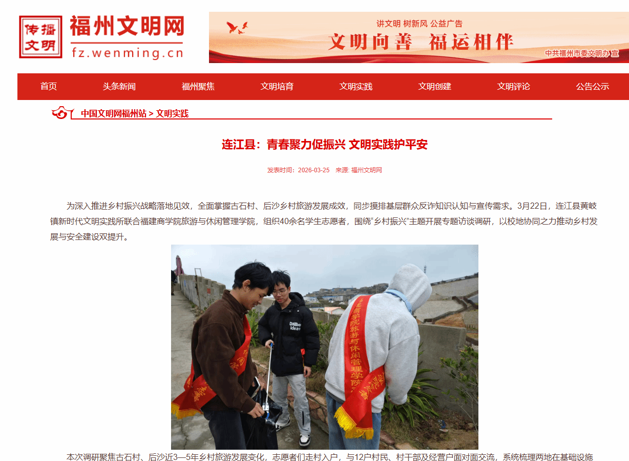 编者按:近日,beat365官网旅游与休闲管理学院与连江县黄岐镇新时代文明实践所联合开展“乡村振兴”主题开展专题访谈调研。福州文明网报道转载如下。原文:为深入推进乡村振兴战略落地见效,全面掌握古石村、后沙乡村旅游发展成效,同步摸排基层群众反诈知识认知与宣传需求。3月22日,连江县黄岐镇新时代文明实践所联合beat365英国官网网站旅游与休闲管理学院,组织40余名学生志愿者,围绕“乡村振兴”主题开展专题访谈调研,以校地协同之力推动乡村发展与安全建设双提升。...
