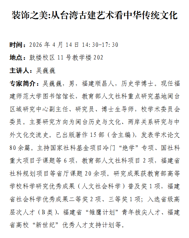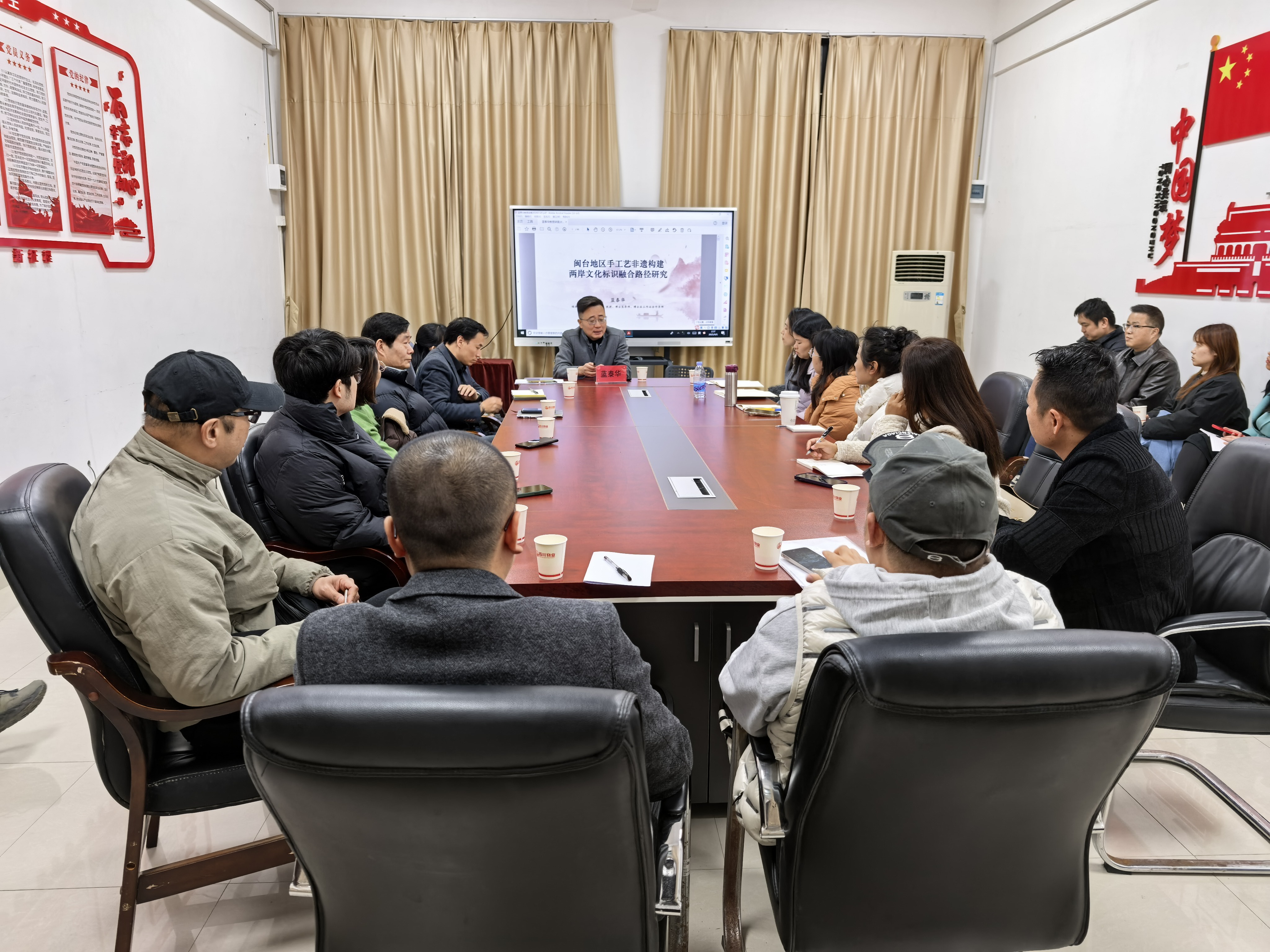 1月20日上午,艺术设计学院邀请福建师范大学美术学院教授、博士生导师蓝泰华,以“闽台地区手工艺非遗构建 两岸文化标识融合路径研究”为主题开展专题讲座,并为学院青年教师提供科研申报专项辅导,助力提升教师科研能力与学术创新水平。科研处、艺术设计学院负责人,艺术设计学院各系主任及青年教师参加讲座。讲座中,蓝泰华从闽台族群迁徙文化脉络切入,系统阐释闽台手工艺非遗的传承特征与文化基因,深入剖析“视觉图像—生活空间—...