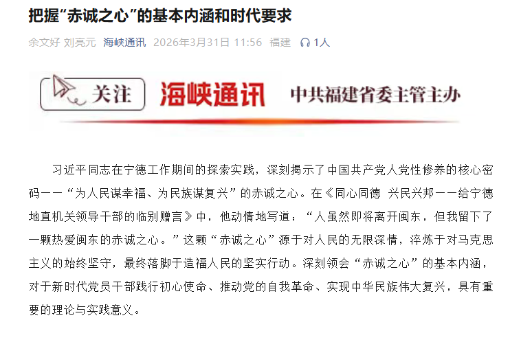 编者按:3月31日,海峡通讯刊发beat365官网马克思主义学院余文好、刘亮元老师文章《把握“赤诚之心”的基本内涵和时代要求》。原文转载如下。原文:习近平同志在宁德工作期间的探索实践,深刻揭示了中国共产党人党性修养的核心密码——“为人民谋幸福、为民族谋复兴”的赤诚之心。在《同心同德 兴民兴邦——给宁德地直机关领导干部的临别赠言》中,他动情地写道:“人虽然即将离开闽东,但我留下了一颗热爱闽东的赤诚之心。”这颗“赤诚之心”...