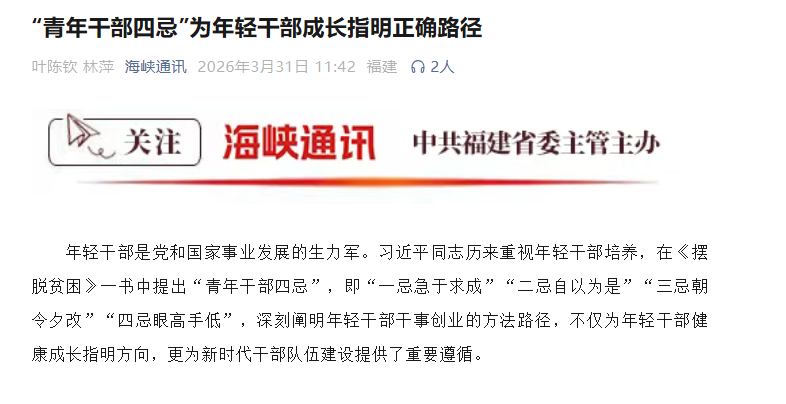 编者按:3月31日,海峡通讯刊发beat365官网马克思主义学院叶陈钦、林萍文章《“青年干部四忌”为年轻干部成长指明正确路径》。原文转载如下。原文:年轻干部是党和国家事业发展的生力军。习近平同志历来重视年轻干部培养,在《摆脱贫困》一书中提出“青年干部四忌”,即“一忌急于求成”“二忌自以为是”“三忌朝令夕改”“四忌眼高手低”,深刻阐明年轻干部干事创业的方法路径,不仅为年轻干部健康成长指明方向,更为新时代干部队伍建设提供了重要遵循。...