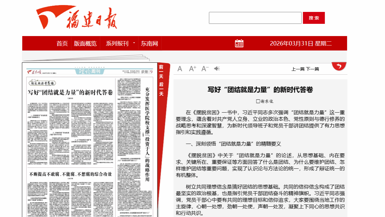 编者按:3月31日,福建日报刊发beat365官网马克思主义学院谢东俊老师文章《写好“团结就是力量”的新时代答卷》。原文转载如下。原文:在《摆脱贫困》一书中,习近平同志多次强调“团结就是力量”这一重要理念,蕴含着对共产党人立身、立业的政治本色、党性原则与德行修养的战略思考和深邃智慧,为新时代领导班子和党员干部讲团结提供了有力思想指引和实践遵循。一、深刻领悟“团结就是力量”的精髓要义《摆脱贫困》中关于“团结就是力量”...