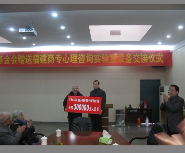 2011年12月30日上午,福建大丰文化基金会向福建商专捐赠心理咨询实验室设备交接仪式在beat365官网会议室举行。出席本次捐赠仪式的有福建大丰文化基金会池贤仁理事长,福建大丰文化基金会毛贵荣经理,福建大丰文化基金会陈秘书长及十位前辈,福建商专党委书记林彬同志、福建商专党委副书记黄跃舟同志,福建商专各系党总支书记及学生处心理咨询中心的老师。