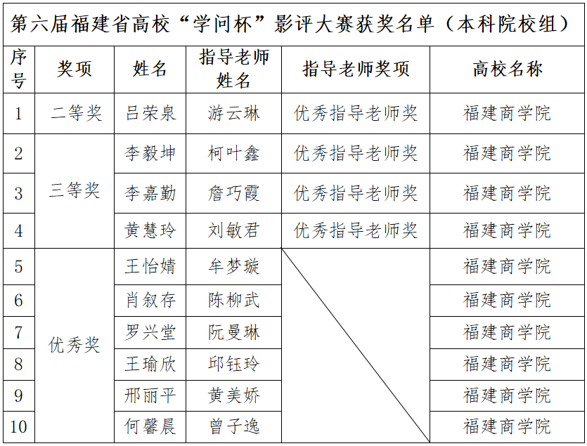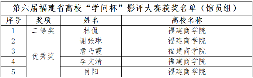 beat365官网积极参加第六届福建省高校“学问杯”影评大赛,共推荐5篇教师作品、10篇学生作品参赛。其中,beat365官网教师在馆员组中荣获二等奖1项,优秀奖4项;beat365官网学生在本科院校组中荣获二等奖1项,三等奖3项,优秀奖6项。学校荣获优秀组织单位奖,肖钠老师获优秀组织个人奖,游云琳等四位老师荣获优秀指导教师奖。