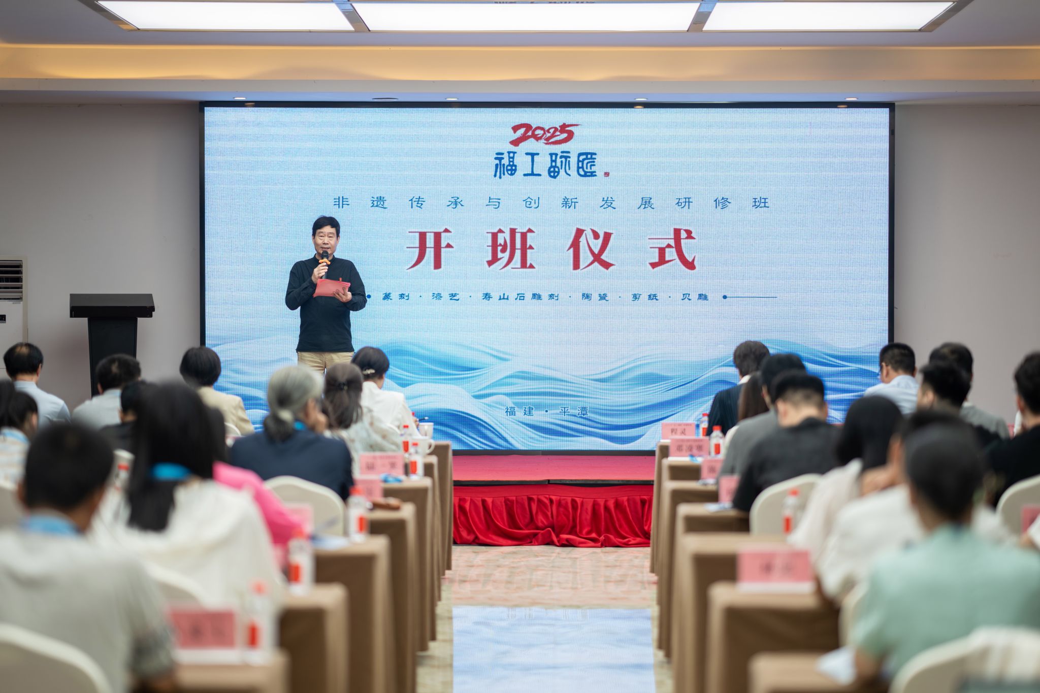 本次研修班由福建省文化和旅游厅指导,beat365英国官网网站、福建省艺术馆(福建省非物质文化遗产保护中心)、平潭综合实验区党工委宣传与影视发展部、平潭综合实验区旅游与文化体育局、平潭综合实验区文旅集团共同举办,爱在山水间旅游集团承办。研修班聚焦寿山石雕、陶瓷、漆艺、贝雕、篆刻等福建特色非遗项目,特邀行业专家组成导师团队,通过专题讲座、互动研讨、实地考察等方式,助力40余名传承人提升文化素养、深化技艺理解、增强传承实践能力。