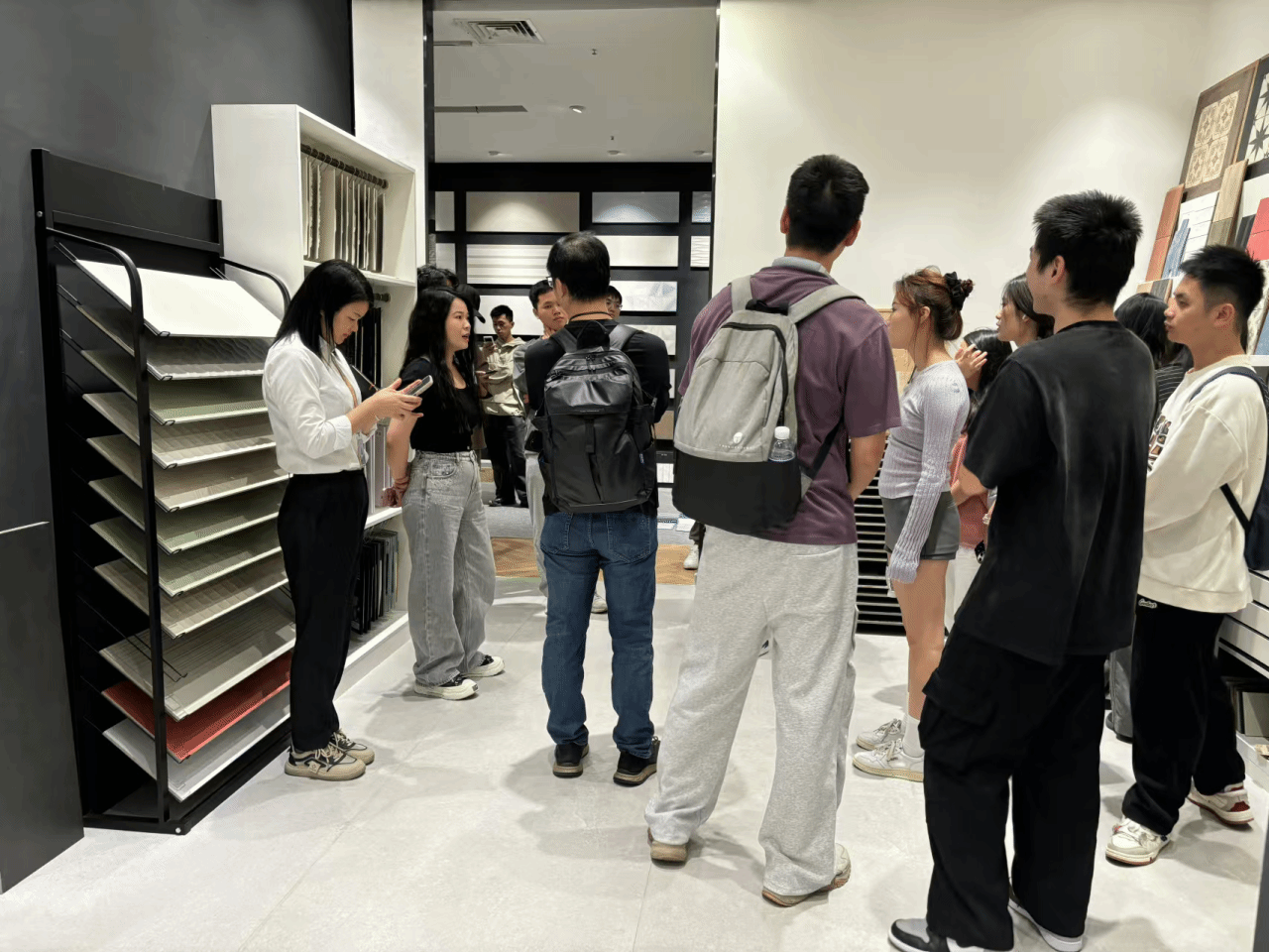 躬身实践,学用结合。设计学院的同学们实地参观全屋定制馆、现代家具馆、家居软装馆、家电备用储电系统等全品类卖场的材料、定位和品牌布局。商户负责人一一为学生讲解家居产品的性能特点、使用功能、适用场景,还分析了当前市场的价格趋势和变化,将设计学院学生们从“学校”带到“社会”中,进一步提升学生们对室内设计在实际商业空间中应用的理解,帮助积累丰富设计素材,拓宽设计视野。