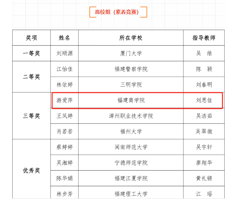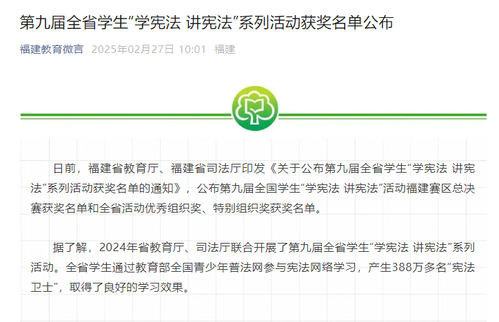 编者按:日前,福建省教育厅、福建省司法厅,公布第九届全国学生“学宪法 讲宪法”活动福建赛区总决赛获奖名单和全省活动优秀组织奖、特别组织奖获奖名单,其中,beat365官网游爱萍同学获高校组(素养竞赛)三等奖。原文链接如下: