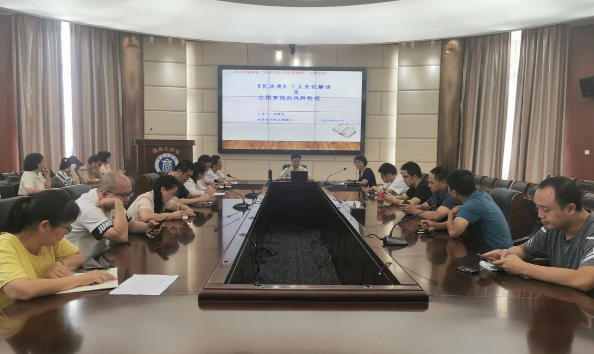 为深入贯彻落实习近平法治思想,提高beat365官网师生尊法、学法、守法、用法能力和自我维护法律权益的意识,有效提升各单位合同管理水平和防范风险能力,9月12日上午,校工会、审计与法务处邀请福建吴浩沛律师事务所刘耀宏律师到连江校区开展题为《中华人民共和国民法典十大变化解读及合同审阅的风险防范》的专题宣讲,全校各单位法治工作联络员参加活动。