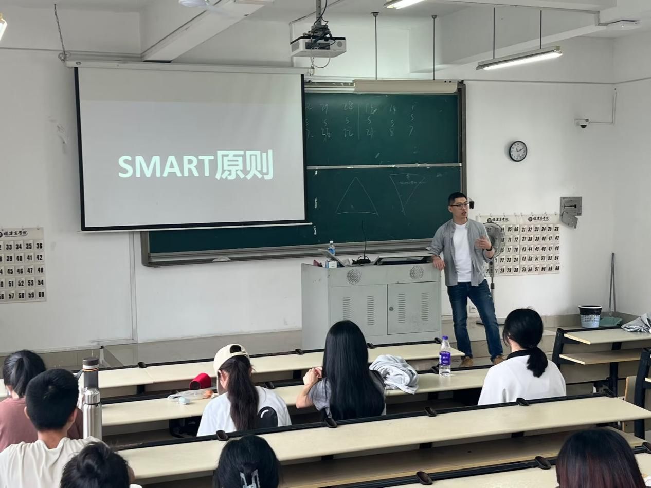 福州泰禾凯宾斯基酒店刘宇经理为商务英语专业学生作题为“合理设立目标--让你从容立Flag”的讲座。刘经理介绍了目标管理工具SMART原则的具体内容,并利用案例展示基于SMART原则的正确和错误的目标设置,内容生动有趣、实用性强。