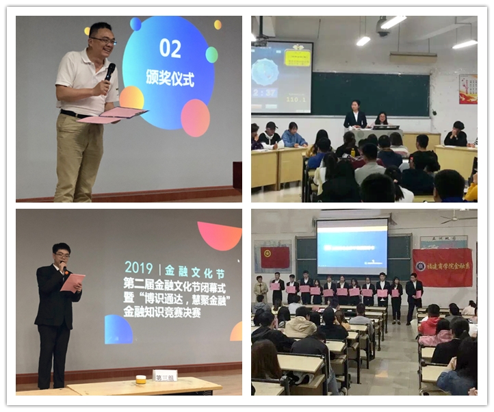 求知、思辨、对话、实践……历时一个月的第二届金融文化节于2019年6月4日圆满落幕。本届金融文化节主要由金融知识竞赛、金融产品推介比赛、理财计算比赛、金融专题辩论赛、金融名师沙龙等活动组成,吸引了来自全校9个学院的优秀学子参加比赛。金融学院党总支书记、学院负责人参与本届金融文化节的各项活动。金融学院全体教师参与赛事的命题和赛前培训工作,专业教师吴启新、林秀清、任勇、陈翠、高山、林源源、谢谭松等担任本届金融文化节赛事的评委。