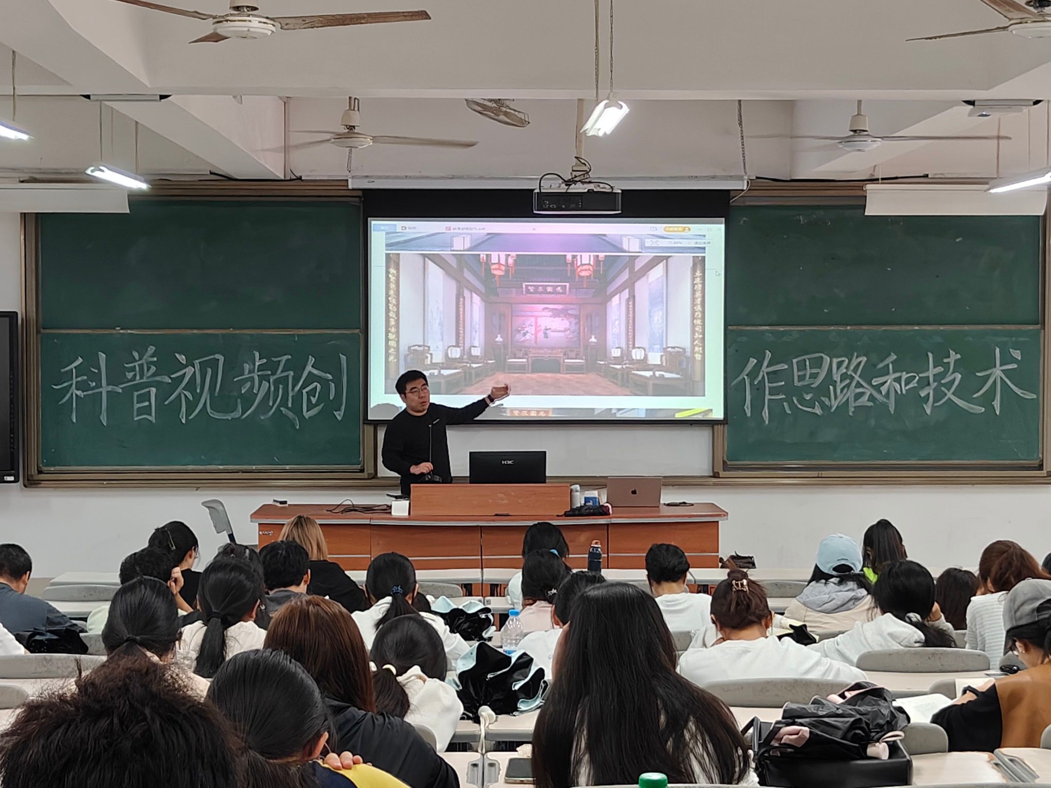 林泓锦老师结合其精心制作的科普视频,从赶考纪游、科考过程、两郡试馆等多个板块深入浅出地进行讲解,并从撰写脚本、设置分镜、制作成片等方面带领大家了解科普视频创造的过程。他表示,在制作科普视频时,要了解当地的历史,从多个视角拍摄,根据场景变化添加视觉上的冲击,增加创意和趣味性,从而准确传达视频的核心内容。
