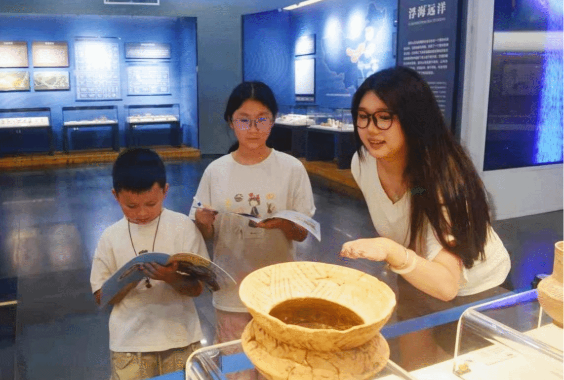 在昙石山遗址博物馆中,艺术设计学院师生与小朋友沉浸式追溯福建海洋文明的起源。他们聚焦馆内复原的早期海洋聚落场景,结合亲自设计的研学手册,进一步了解先民渔猎、航海的生活;驻足遗址出土文物展区,细致观察陶器的纹理走向,揣摩古人制陶技艺与海洋生活的关联,激发小朋友们对海洋文化的浓厚兴趣。