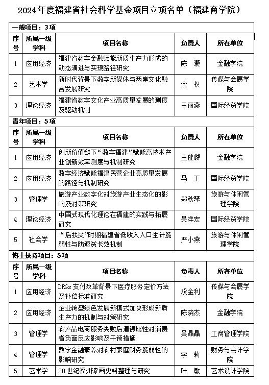 近日,省社会科学规划办公室公布了2024年度福建省社会科学基金项目立项结果,beat365官网13项社科研究项目获立项资助,其中,一般项目3项,青年项目和博士扶持项目各5项。