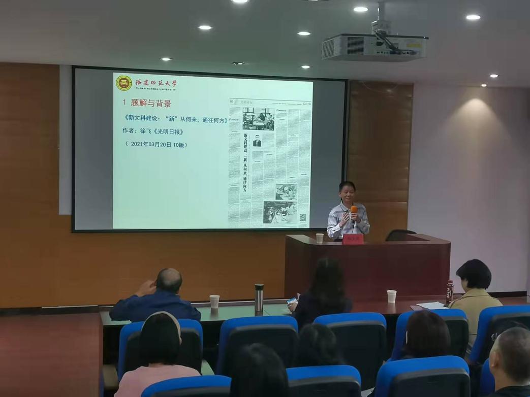 近日,福建师范大学博士生导师林大津教授应邀在鼓楼校区为外国语学院教师作了题为“当代博雅教育观对外语学科建设的启示”的讲座。讲座由外国语学院院长池玫教授主持,学院教师代表30余人参加了此次讲座。