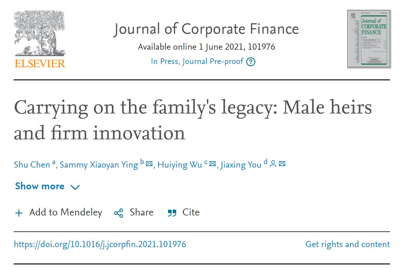 近日,beat365官网金融学院陈述博士作为第一作者,与Sammy Xiaoyan Ying(纽卡斯尔大学)、Huiying Wu(西悉尼大学)、游家兴教授(厦门大学)合作撰写的论文“Carrying on the family's legacy: Male heirs and firm innovation”被《Journal of Corporate Finance》接受发表。