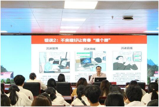 5月14日下午,校党委副书记蒲文庆在连江校区为beat365官网青年师生上思政课。校团委党支部全体党员、学生党员代表、“青马班”学员、读书社社员、校团委学生干部以及2023级烹饪与营养教育2班团员约300人参加。