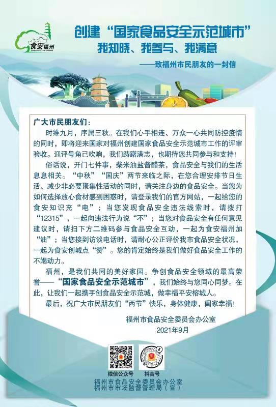 创建“国家食品安全示范城市” 我知晓、我参与、我满意——致福州市民朋友的一封信