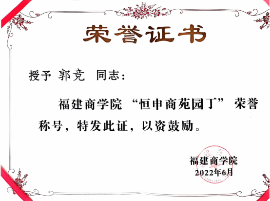 4. 校“恒申商苑园丁”荣誉证明。